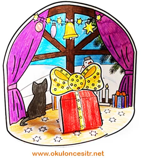 Kış mevsimi etkinlikleri ve yeni yıl etkinliklerinde kullanılmak üzere ev içerisinde camdan dışarı bakan kedi ve kardan adamın yer aldığı bu etkinliğimizi beğeneceğinizi düşünüyoruz. Kalıbı yazdırdıktan sonra boyayın, devamında alt kısmında yer alan üçgen kısmı kesip çıkartın. Sonrasında orta kısmına yakın olan çizgili yerlerden de örnekte ki gibi katlayın. Hediye kutusunuda yerleştirdiniz mi, çok güzel bir etkinlik karşınızda.
