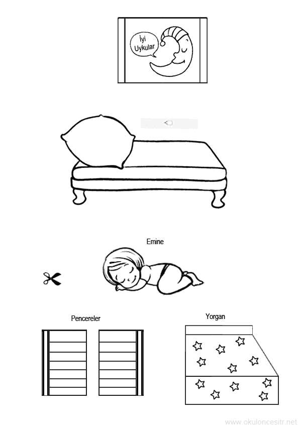 Okul öncesi anasınıfı etkinliklerinde kullanılmak üzere yatakta uyuyan kız kalıbı, üç boyutlu yatakta yorgan altında uyuyan kız kalıbı indir yazdır çıkart.