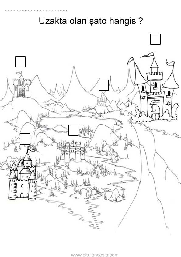 Uzak yakın kavramı çalışma sayfası etkinlikleri ile kale, şato uzak yakın mekanda konum kavramları çalışmaları etkinliği örnekleri kağıdı indirme, çıktı yazdırma. Free far and near worksheets download printable.