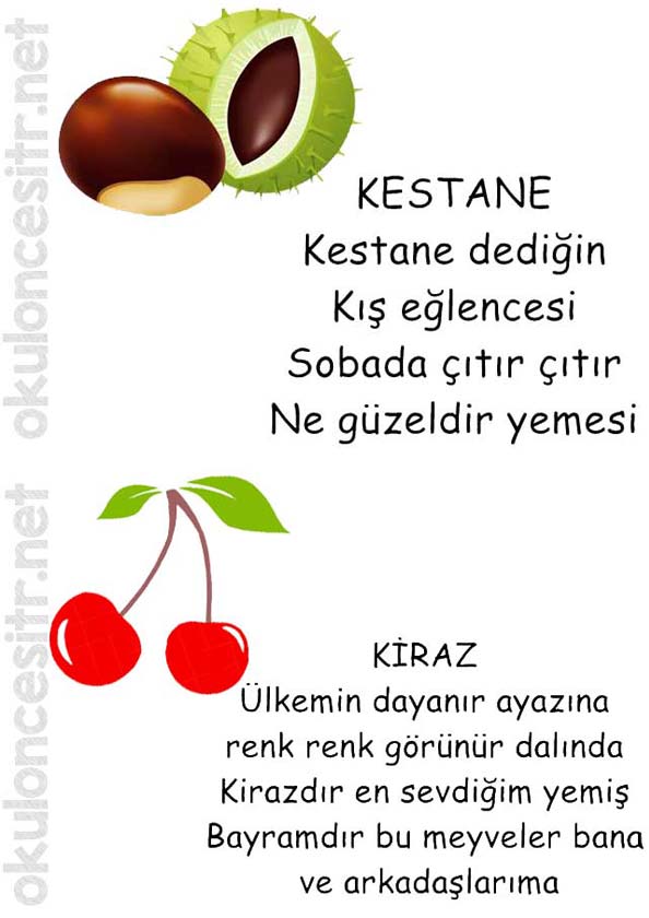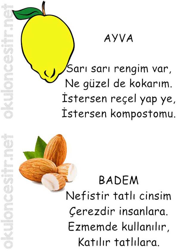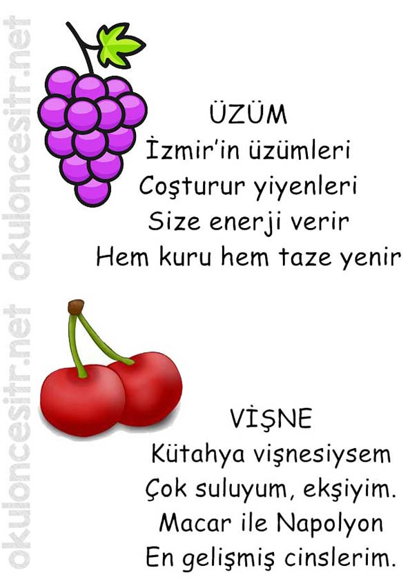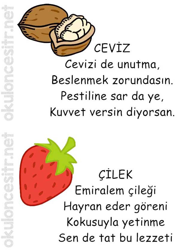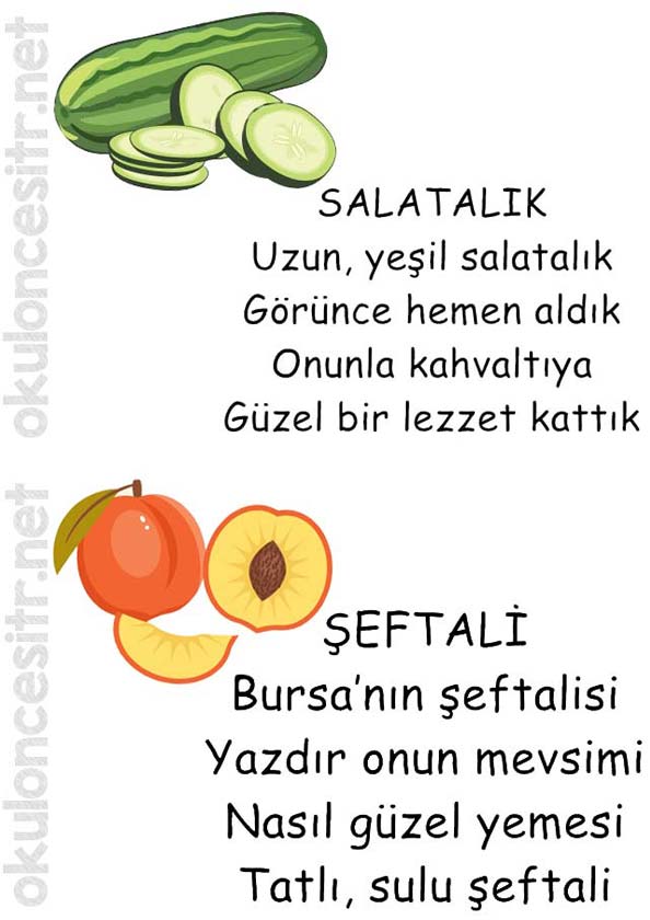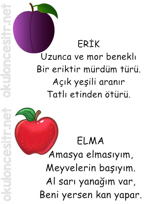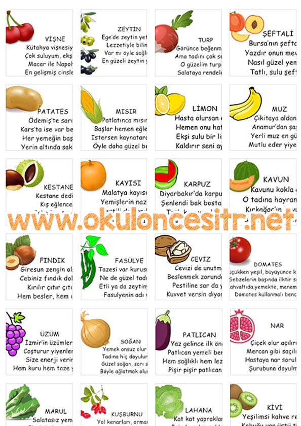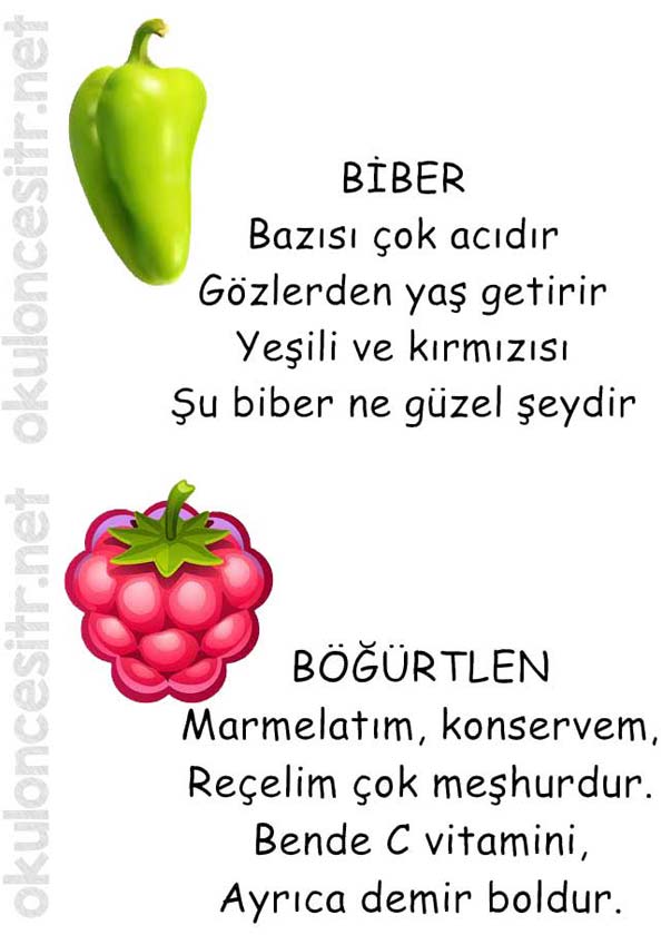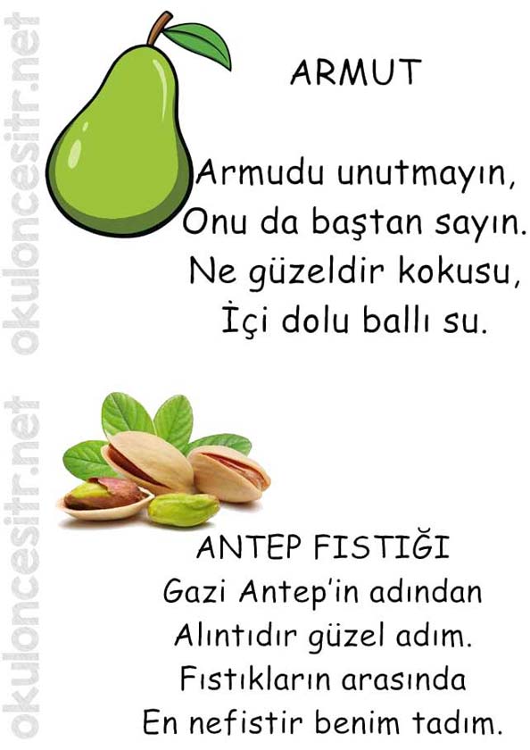 Okul öncesi, anasınıfı ilkokul, ortaokul armut şiiri, antepfıstığı şiiri, ayva şiiri, badem şiiri, biber şiiri, böğürtlen şiiri, ceviz şiiri, çilek şiiri, domates şiiri, dut şiiri, erik şiiri, elma şiiri, fasulye şiiri, fındık şiiri, havuç şiiri, hurma şiiri, ıspanak şiiri, karpuz şiiri, kavun şiiri, kayısı şiiri, kestane şiiri, kiraz şiiri, kivi şiiri, kuşburnu şiiri, lahana şiiri, limon şiiri, mandalina şiiri, marul şiiri, mısır şiiri, muz şiiri, nar şiiri, patates şiiri, patlıcan şiiri, portakal şiiri, salatalık şiiri, şeftali şiiri, soğan şiiri, turp şiiri, üzüm şiiri, vişne şiiri, zeytin şiiri