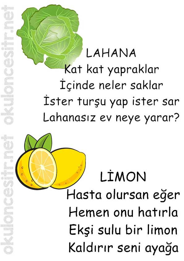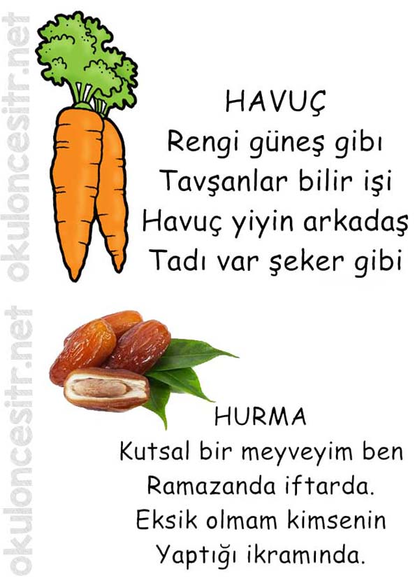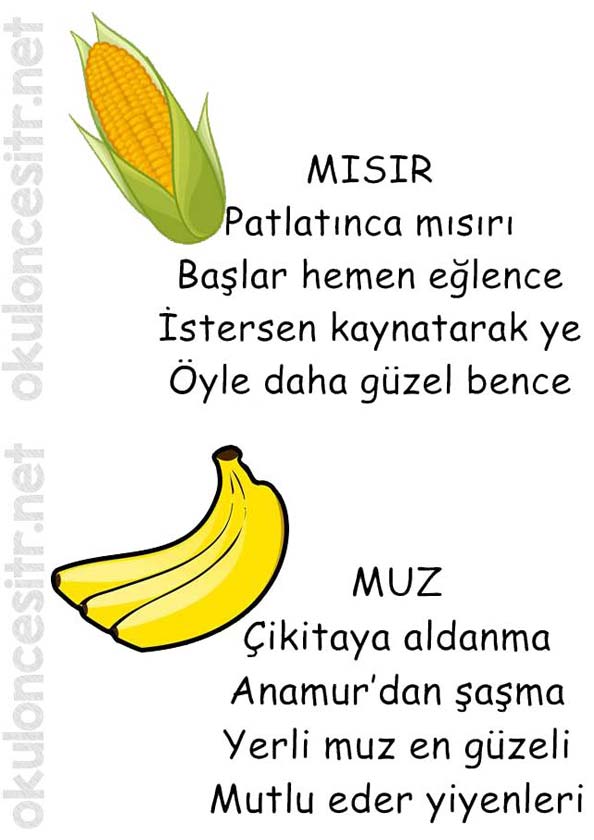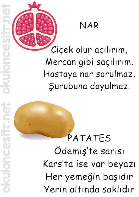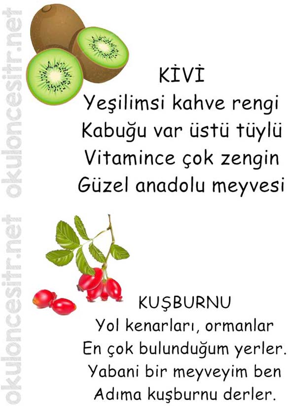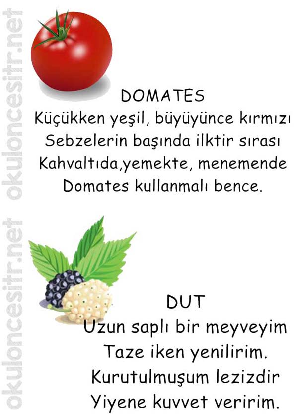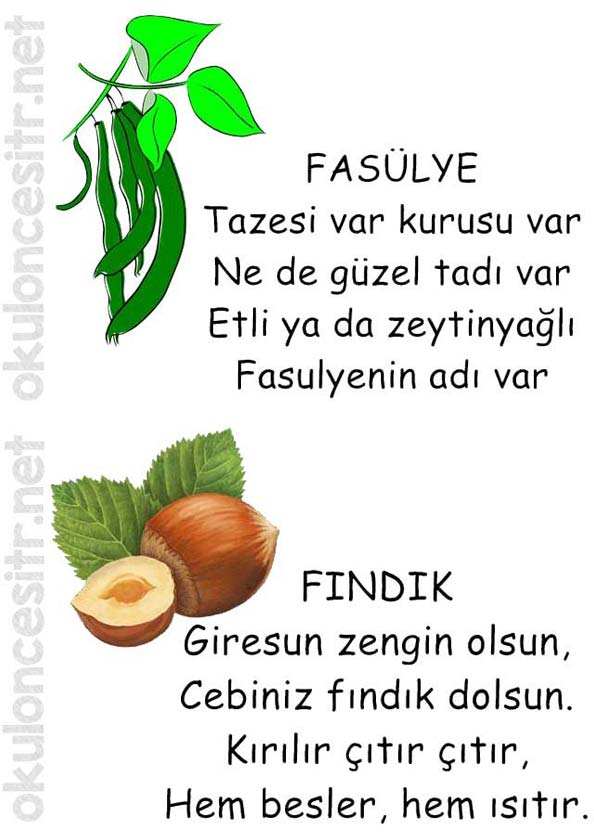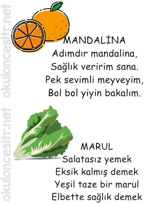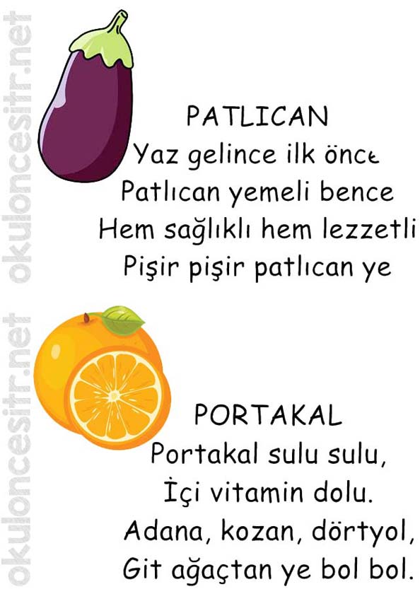 Okul öncesi, anasınıfı ilkokul, ortaokul armut şiiri, antepfıstığı şiiri, ayva şiiri, badem şiiri, biber şiiri, böğürtlen şiiri, ceviz şiiri, çilek şiiri, domates şiiri, dut şiiri, erik şiiri, elma şiiri, fasulye şiiri, fındık şiiri, havuç şiiri, hurma şiiri, ıspanak şiiri, karpuz şiiri, kavun şiiri, kayısı şiiri, kestane şiiri, kiraz şiiri, kivi şiiri, kuşburnu şiiri, lahana şiiri, limon şiiri, mandalina şiiri, marul şiiri, mısır şiiri, muz şiiri, nar şiiri, patates şiiri, patlıcan şiiri, portakal şiiri, salatalık şiiri, şeftali şiiri, soğan şiiri, turp şiiri, üzüm şiiri, vişne şiiri, zeytin şiiri