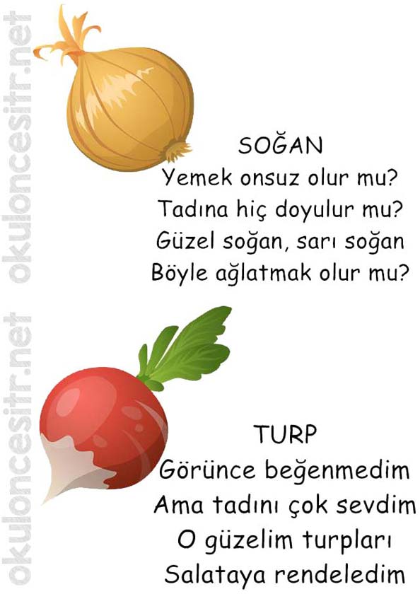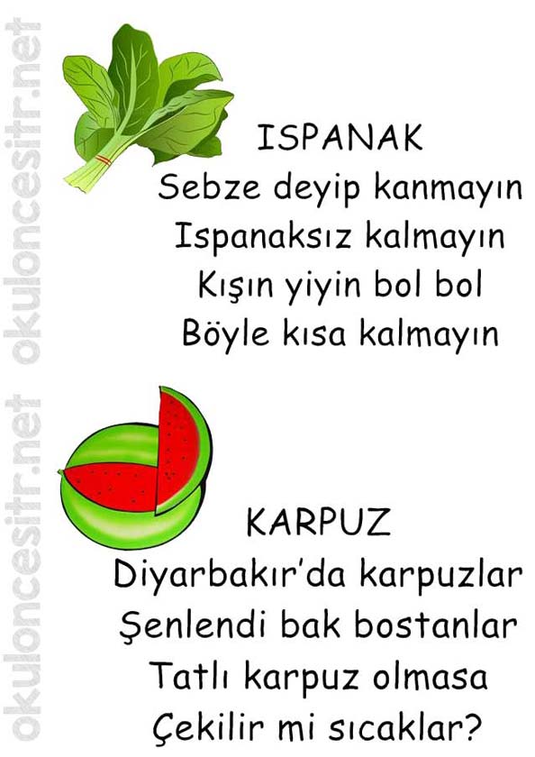 Yerli malı haftası için ülkemizde yetişen sebze ve meyvelerin yer aldığı; antepfıstığı, armut, ayva, badem, böğürtlen, ceviz, çilek, dut, elma, fındık, hurma, karpuz, kavun, kayısı, kestane, kiraz, kivi, mandalina, erik, muz, nar, portakal, şeftali, üzüm, vişne, zeytin, kuşburnu, biber, domates, fasulye, havuç, ıspanak, lahana, limon, marul, mısır, patates, patlıcan, salatalık, soğan, turp ile ilgili kısa şiirler ve özellikleri.